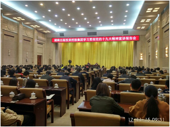 11月15日上午,湖南出版投資控股集團學(xué)習貫徹黨的十九大精神宣講報告會在九所賓館會議中心舉行。黨的十九大代表、湖南新聞出版廣電局黨組書記朱建綱應(yīng)邀作輔導(dǎo)報告,集團黨委書記、董事長,中南傳媒董事長龔曙光主持會議。集團黨委領(lǐng)導(dǎo)、中南傳媒高管、子分公司全體集團管理干部、控股集團和中南傳媒總部員工共300余人參加會議。