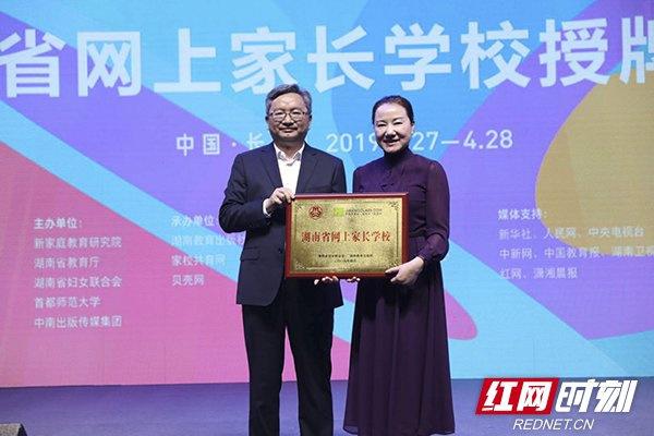 湖南省婦聯(lián)主席、黨委書記姜欣(右)向湖南教育出版社家校共育網(wǎng)授牌,成立“湖南省網(wǎng)上家長(zhǎng)學(xué)校”。
