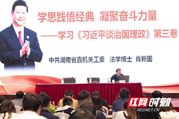 中共湖南省直機(jī)關(guān)工委辦公室主任、法學(xué)博士肖新國進(jìn)行《習(xí)近平談治國理政》第三卷專題輔導(dǎo)。