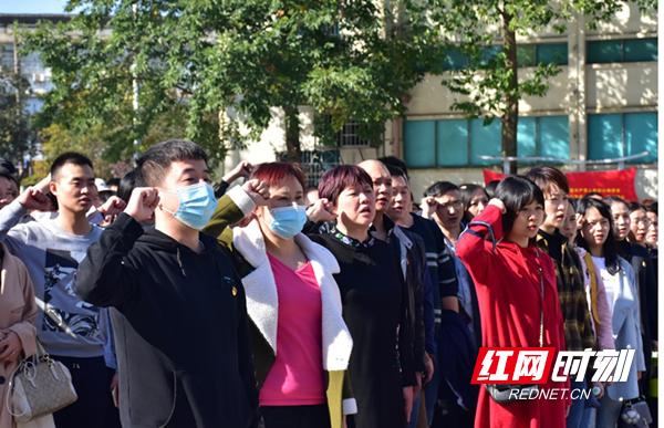 全體學(xué)員在蔡和森銅像廣場面對黨旗莊嚴(yán)重溫入黨誓詞。