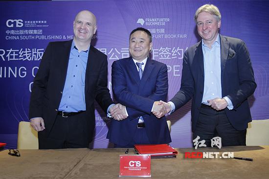 法蘭克福書展主席尤根·博斯,法蘭克福書展副主席、IPR在線版權(quán)交易有限公司總裁托馬斯·明庫斯,湖南出版投資控股集團黨委書記、董事長、中南出版?zhèn)髅郊瘓F董事長龔曙光共同簽署了合作協(xié)議。